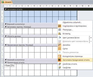 В результате этих действий в бланке отчета появится раздел Примечание группы, рис.35. Для добавления в отчет Заголовка и Примечания, нужно щелкнуть правой кнопкой на бланке отчета и в появившемся меню выбрать команду Заголовок/примечание отчета рис.35.