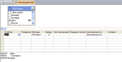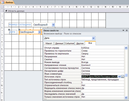 Для того чтобы исключить дублирование дат, нужно найти свойство Источник строк поля Дата формы Выбор рис. 40. Открыть запрос являющийся источником строк и установить в нем группировку по полю Дата рис.41.