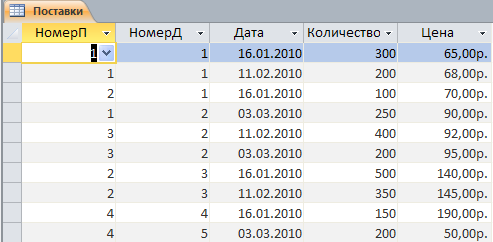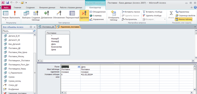 На рис.24 приведен пример запроса на удаление поставок от поставщика 4 осуществленные 11.02.2010.