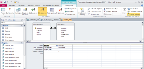 На рис.23 приведен пример запроса, который увеличивает на 1 статус поставщиков, которые поставляли деталь с номером 2.