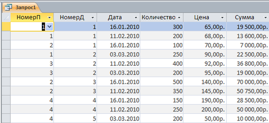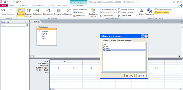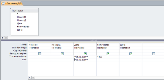 На рис.13 приведен пример многотабличного запроса. Данный запрос выводит данные о поставщиках и поставках, которые были осуществлены 16.01.2010. Результат выполнения этого запроса показан на рис.14.