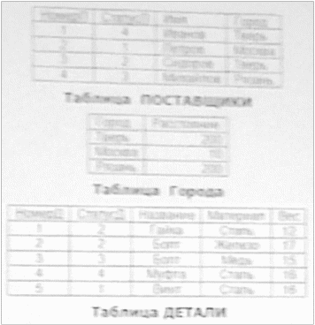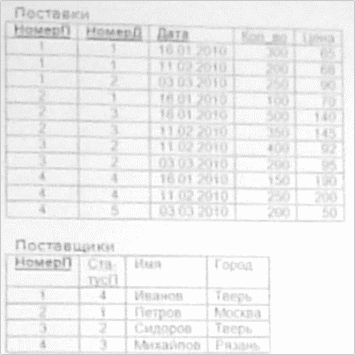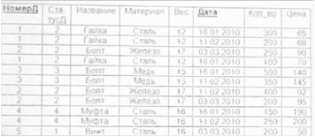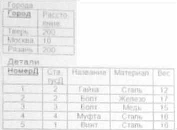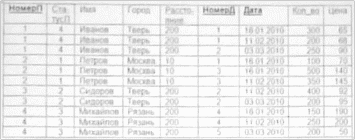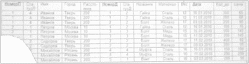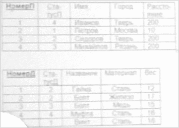 | НомерП | СтатусП | И мя | Г о р о д | Расстояние | НомерД | СтатусП | Наз ва ние | Ма те ри ал | В ес | Д а та | К ол во | Ц е н а |