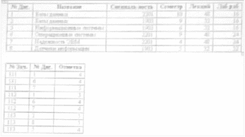 В рассматриваемом примере атрибутом, характеризующим связь, является Отметка. Очевидно, что её нельзя поместить ни в таблицу, описывающую свойства сущности Студент, ни в таблицу, описывающую свойства сущности Дисциплина.