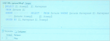 Решим обратную задачу. Необходимо найти такие детали для которых не существует других деталей, изготовленных из того же материала. При решении этой задачи на взгляд автора, нельзя обойтись без использования псевдонимов.