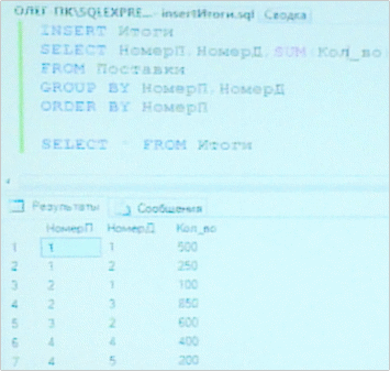 Создадим таблицу Итоги, которая должна содержать номера деталей, которые поставил каждый поставщик и общее количество каждой детали.