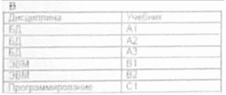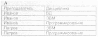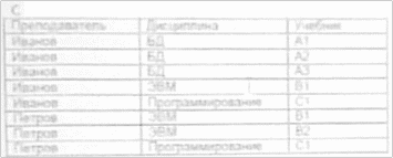 Применив операцию реляционного соединения к отношению А и В получим отношение, которое будет содержать две независимые многозначные зависимости, что приведет к избыточному дублированию данных. Для каждого учебника по каждой дисциплине будет дублироваться фамилия преподавателя.