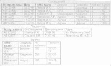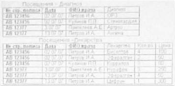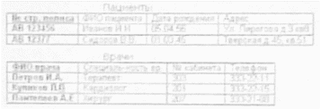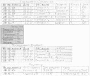 Рассмотрим задачу проектирования БД для регистрации посещений поликлиники. В таблице 1 представлены данные, которые должны храниться в БД. Пациент посещает врача, врач его осматривает, ставит диагноз и выписывает лекарство.