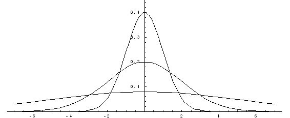 Построены графики при т =0 и трех возможных значениях среднего квадратичного отклонения s = 1, s = 2 и s = 7. Как видно, при увеличении значения среднего квадратичного отклонения график становится более пологим, а максимальное значение уменьшается..