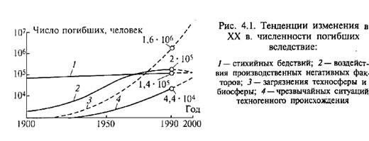 Качественное изменение значимости негативных факторов в XX в. показано на рис. 4.1. Производственные негативные факторы (кривая 2) заявили о себе еще в XIX в., в XX столетии достигнута их стабилизация. В ряде стран производственный травматизм с летальным исходом в последние годы снижается, что является результатом эффективности принимаемых мер защиты. Уровни и масштабы воздействия других негативных факторов постоянно нарастают.