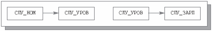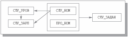 Для преодоления этих трудностей произведем декомпозицию переменной отношения СЛУЖ на две переменных отношений – СЛУЖ1 {СЛУ_НОМ, СЛУ_УРОВ} и УРОВ {СЛУ_УРОВ, СЛУ_ЗАРП}. По теореме Хита, это снова декомпозиция без потерь по причине наличия, например, FD СЛУ_НОМ