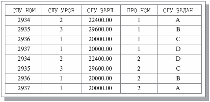 Заметим, что допустимое значение переменной отношения СЛУЖ может содержать кортежи, информационное наполнение которых выходит за пределы допустимых значений переменной отношения СЛУЖАЩИЕ_ПРОЕКТЫ_ЗАДАНИЯ. Например, в теле отношения СЛУЖ может находиться кортеж с данными о служащем с номером 2938, который еще не участвует ни в одном проекте. Наличие такого кортежа не влияет на результат естественного соединения, тело которого все равно будет совпадать с телом допустимого значения переменной отношения СЛУЖАЩИЕ_ПРОЕКТЫ_ЗАДАНИЯ.