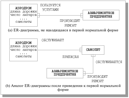 На рис. 9.9 (a) показана диаграмма, в которой тип сущности АЭРОДРОМ не удовлетворяет требованию первой нормальной формы. Здесь для нас несущественны атрибуты сущности АВИАРЕМОНТНОЕ ПРЕДПРИЯТИЕ, но сущность АЭРОДРОМ помимо атрибутов, отражающих собственные характеристики аэродромов (длина взлетно-посадочной полосы, число ангаров и т.д.) содержит атрибут, множественное значение которого характеризует самолеты, приписанные к этому аэродрому. Очевидно, что самолеты нуждаются в ремонте, т. е. должны обслуживаться некоторым авиаремонтным предприятием. Но поскольку самолеты являются частью сущности АЭРОДРОМ, единственным способом фиксации этого факта на диаграмме является проведение связи «многие ко многим» между типами сущности АЭРОДРОМ и АВИАРЕМОНТНОЕ ПРЕДПРИЯТИЕ. Таким образом выражается то соображение, что для ремонта разных самолетов, приписанных к одному аэродрому, могут использоваться разные транспортные предприятия, и каждое транспортное предприятие может обслуживать несколько аэродромов.