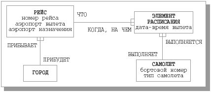 На рис. 9.10 (b) показан нормализованный вариант диаграммы, в котором все сущности находятся во второй нормальной форме. Теперь имеются три типа сущности: РЕЙС с атрибутами номер рейса, аэропорт вылета, аэропорт назначения, ЭЛЕМЕНТ РАСПИСАНИЯ с атрибутами дата-время вылета, бортовой номер самолета, тип самолета и ГОРОД. Уникальным идентификатором сущности РЕЙС является атрибут номер рейса, уникальный идентификатор ЭЛЕМЕНТ РАСПИСАНИЯ состоит из атрибута дата вылета и конца связи КОГДА, НА ЧЕМ. Мы видим, что ни в одном типе сущности больше нет атрибутов, определяемых частью уникального идентификатора. Свойства второй нормальной формы удовлетворяются, и мы имеем более качественную диаграмму.