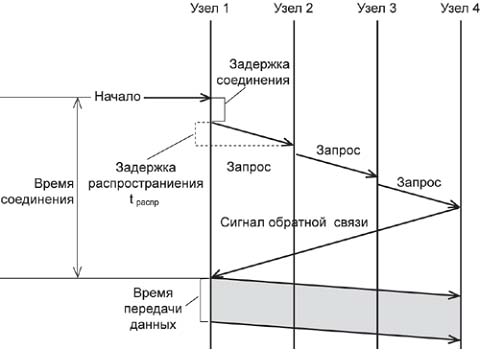 При коммутации каналов коммутационная сеть образует между конечными узлами непрерывный составной физический канал из последовательно соединенных коммутаторами промежуточных канальных участков. Условием того, что несколько физических каналов при последовательном соединении образуют единый физический канал, является равенство скоростей передачи данных в каждом из составляющих физических каналов. Равенство скоростей означает, что коммутаторы такой сети не должны буферизовать передаваемые данные.