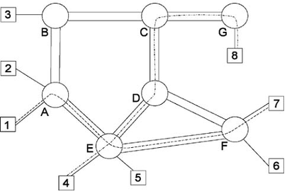 Например, если сеть, изображенная на рис. 1, работает по технологии коммутации каналов, то узел 1, чтобы передать данные узлу 7, сначала должен передать специальный запрос на установление соединения коммутатору A, указав адрес назначения 7. Коммутатор А должен выбрать маршрут образования составного канала, а затем передать запрос следующему коммутатору, в данном случае E. Затем коммутатор E передает запрос коммутатору F, а тот, в свою очередь, передает запрос узлу 7. Если узел 7 принимает запрос на установление соединения, он направляет по уже установленному каналу ответ исходному узлу, после чего составной канал считается скоммутированным, и узлы 1 и 7 могут обмениваться по нему данными.