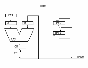 Из оперативной памяти по входной информационной шине Швх в АЛУ поступают операнды: положительные числа в прямом, а отрицательные в дополнительном кодах. Операнды помещаются в регистр А (RA)-первое слагаемое, и регистр B (RВ)- второе слагаемое. Регистр R1 связан с RВ.