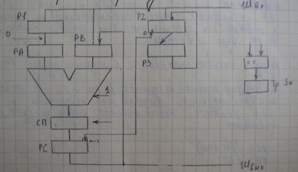 В состав АЛУ входят n-разрядный параллельный комбинационный сумматор-(КС), регистр сумматора RC, входные регистры сумматора RА и RВ, входной регистр АЛУ- R1. Длина всех регистров =длине операндов=n.