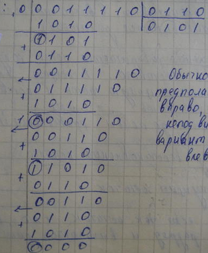Знаковые разряды делимого и делителя сбрасываем и сдвигаем делимое на один разряд влево.