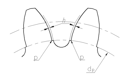 При шлифовании профилей зубьев после термической обработки образуются уступы ( рис. 3.1 ) из-за нешлифованной части впадины высотой h и радиусом в месте перехода p. При изготовлении колес с уступом у впадины зубьев, не требуется дополнительной оснастки и специального инструмента (червячных фрез, долбяков и т. д.). Однако выполнить при шлифовании радиус p нужного размера бывает очень трудно, так как при толщине снимаемого слоя при шлифовании 0,1…0,25 мм шлифовальный круг разрушается. Кроме того, радиус p в месте уступа вызывает концентрацию напряжений, что существенно снижает прочность зубчатого колеса.