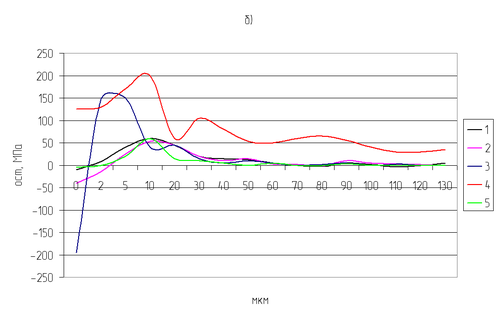 На рис. 3.6 представлены результаты измерения остаточных напряжений на зубчатом колесе из стали 14ХГСН2МА после цементации и закалки на твердость 64 HRC. Представлены следующие варианты профилирования зубьев: