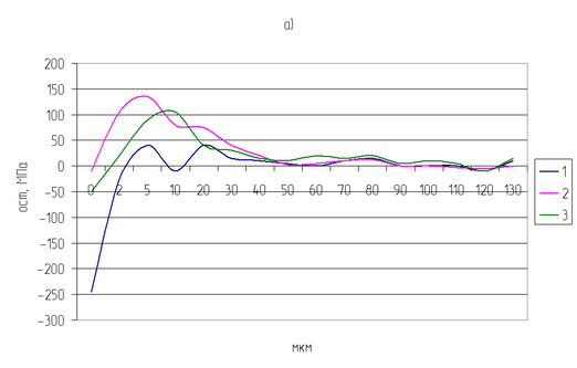 На рис. 3.5 показана эпюра распределения остаточных напряжений по глубине поверхностного слоя образцов, вырезанных из прямозубой рейки. Рейка из стали 16Х3НВФМБ-Ш, закаленная на твердость 40 HRC. Представлено три варианта профилирования зубьев: