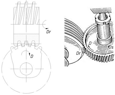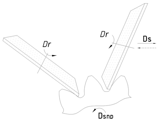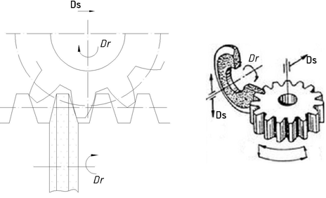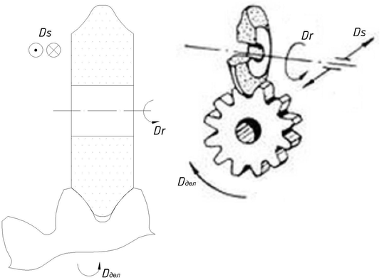 | Шлифование одним дисковым шлифовальным кругом, рабочие поверхности которого при возвратно-поступательном движении образуют плоскости, соответствующие поверхности зубьев исходного контура одного зуба инструментальной рейки. Во время обработки шлифовальный круг получает главное вращательное Dr и возвратно-поступательное Ds движение вдоль оси колеса, а заготовка вращается вокруг своей оси Dr и одновременно прямолинейно перемещается Ds. Поступательное перемещение заготовки согласовано с вращением так, что заготовка как бы катится по воображаемой инструментальной рейке. После того как шлифовальный круг выходит за пределы активной части линии зацепления обработка заканчивается. Шлифовальный круг отводится в радиальном направлении от заготовки. Возвращается в исходное положение, а заготовка совершает делительный поворот. После подвода заготовки к шлифовальному кругу начинается новый цикл шлифования следующей впадины. |