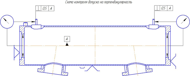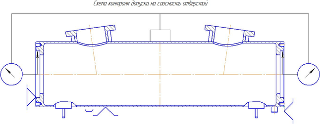 Несоосность контролируемых отверстий на рис.2 не более 0.5мм. Превышение данного требования может привести к неправильной установке последующих деталей и перекосу всего устройства и в последствии, его выхода из строя. Схема контроля представлена на рис.5