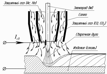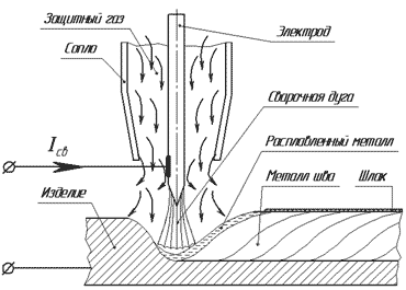 При сварке неплавящимся электродом в защитном газе (рисунок 22) в зону дуги, горящей между неплавящимся электродом и изделием через сопло подаётся защитный газ, защищающий неплавящийся электрод и расплавленный основной металл от воздействия активных газов атмосферы. Теплотой дуги расплавляются кромки свариваемого изделия. Расплавленный металл сварочной ванны, кристаллизуясь, образует сварной шов.
