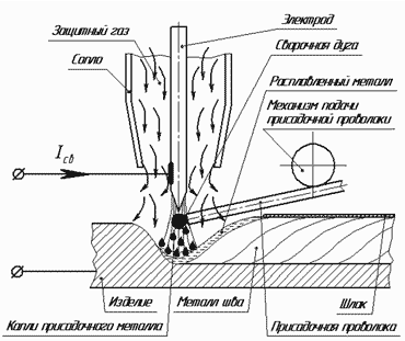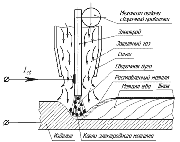 При сварке плавящимся электродом в защитном газе (рисунок 25) в зону дуги, горящей между плавящимся электродом (сварочной проволокой) и изделием через сопло подаётся защитный газ, защищающий металл сварочной ванны, капли электродного металла и закристаллизовавшийся металл от воздействия активных газов атмосферы. Теплотой дуги расплавляются кромки свариваемого изделия и электродная (сварочная) проволока. Расплавленный металл сварочной ванны, кристаллизуясь, образует сварной шов.