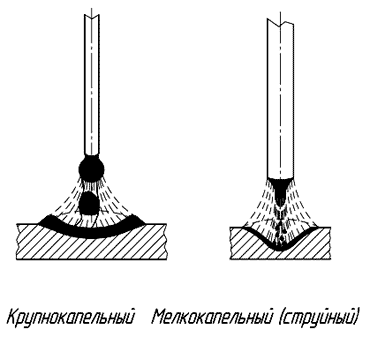 Наименьшие потери на разбрызгивание наблюдаются при мелкокапельном переносе электродного металла. В определённом диапазоне сварочных токов (плотностей сварочных токов) перенос электродного металла приобретает мелкокапельный (струйный характер). Образовавшаяся на торце электрода, при таком процессе, капля не растягивается и не увеличивается до соприкосновения с основным металлом, что не приводит к коротким замыканиям, взрывам и образованиям брызг.
