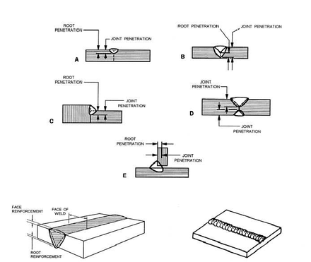 Having an adequate root opening is essential for root penetration. Root penetration refers to the depth that a weld extends into the root of the joint. Root penetration is measured on the centre line of the root cross section. Joint penetration refers to the minimum depth that a groove (or a flange) weld extends from its face into a joint, exclusive of weld reinforcement. As you can see in the figure, the terms, root penetration and joint penetration, often refer to the same dimension. Weld reinforcement is a term used to describe weld metal in excess of the metal necessary to fill a joint.