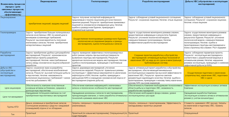 Представленный набор элементарных составляющих может быть исследован на взаимное дополнение на основе базовой модели бизнес-процессов. Пример построения подобной матрицы приведен на рис. 2.16. Данная матрица составлена для нефтяной компании (направление «Добыча») и позволяет выявить взаимосвязи между бизнес-процессами, целями и КПЭ. В заголовках строк и столбцов перечислены основные бизнес-процессы, на их пересечении – информация что является важным результатом для процесса, указанного в заголовке строки, получаемым от бизнес-процесса, указанного в заголовке столбца. Анализ указанных задач, а также ожиданий акционеров и менеджеров компании (приведенных в нижних строках матрицы), позволяют выявить приоритетные КПЭ, являющимися «драйверами» для проведения расчетов всех остальных КПЭ (процедура согласования КПЭ по значениям). Типы КПЭ также указаны в нижних строках матрицы. Таким образом, интегральный анализ финансово-материальных потоков, позволяет финализировать процесс согласования КПЭ, определить и уточнить зоны ответственности и особенности межфункционального взаимодействия в рамках компании.