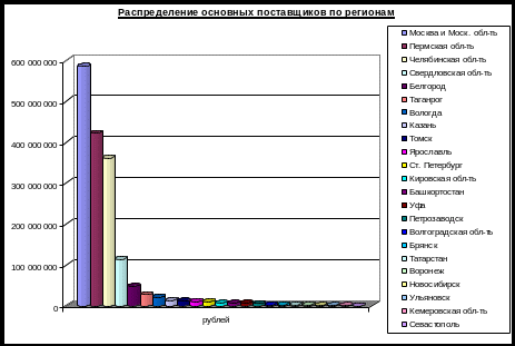 В 2005 году компания работала со 140 поставщиками. Основными поставщиками товарных позиций являются предприятия пермской, московской, челябинской, свердловской, белгородской областей. Диаграмма регионального распределения поставщиков представлена на рис. 3.3.