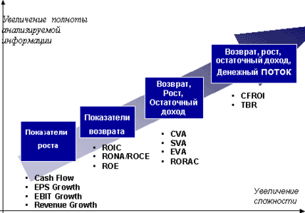 Система показателей, характеризующих деятельность компании в рамках концепции управления стоимостью, постоянно обновляется. По мере внедрения современных информационных технологий, появления новых идей показатели становятся все более объективными и сложными (рис. 1.9.).