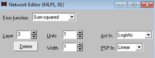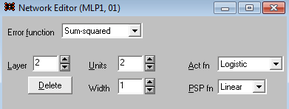 Для обучения сетей типа «Многослойный персептрон» (MLP) и «Линейная» выбираем алгоритм обратного распространения ошибки, при котором корректировка весов осуществляется после очередного наблюдения, что приводит к минимизации ошибки. Выбранная функция ошибок – квадратичная. При создании MLP-сетей для 1-ого и 4-ого слоёв назначаем функцию активации типа «Linear», для 2-ого и 3-го – типа «Logistic» (рис. 5).