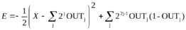 Когда Е минимизировано, то получаются нужные выходы. Первое выражение в скобках минимизируется, когда двоичное число, образованное выходами, наиболее близко (в среднеквадратичном смысле) к аналоговой величине входа X. Второе выражение в скобках обращается в нуль, когда все выходы равны 1 или 0, тем самым накладывая ограничение, что выходы принимают только двоичные значения.