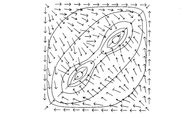 Если велико, непрерывные системы функционируют подобно дискретным бинарным системам, окончательно стабилизируясь со всеми выходами, близкими нулю или единице, т. е. в вершине единичного гиперкуба. С уменьшением устойчивые точки удаляются от вершин, последовательно исчезая по мере приближения к нулю. На рис. 6.3 показаны линии энергетических уровней непрерывной системы с двумя нейронами.