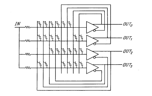 Целью является такой выбор сопротивлений (весов), что непрерывно растущее напряжение X, приложенное к одновходовому терминалу, порождает множесство из четырех выходов, представляющих двоичную запись числа, величина которого приближенно равна входному напряжению (рис. 6.5). Определим сначала функцию энергии следующим образом: