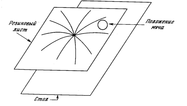 Этот процесс может быть визуально представлен в форме направленного движения мяча по резиновой ленте, вытянутой над столом, причем каждому запомненному образу соответствует точка, «вдавленная» в направлении поверхности стола. Рис. 7.2 иллюстрирует данную аналогию с одним запомненным образом. Данный процесс формирует минимум гравитационной энергии в каждой точке, соответствующей запомненному образу, с соответствующим искривлением поля притяжения в направлении к данной точке. Свободно движущийся мяч попадает в поле притяжения и в результате будет двигаться в направлении энергетического минимума, где и остановится.