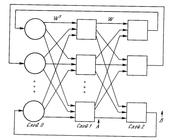Заметим, что как и в описанных ранее сетях слой 0 не производит вычислений и не имеет памяти; он является только средством распределения выходных сигналов слоя 2 к элементам матрицы Wt.