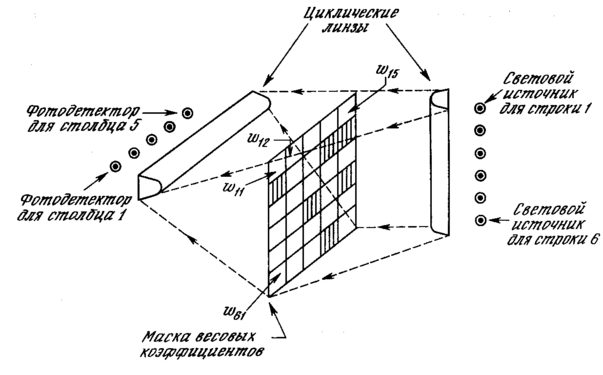 Таким образом, луч 1 освещает и w11 w12 w15. В качестве маски может быть использована фотопленка, у которой прозрачность каждого квадрата пропорциональна весу. С левой стороны расположена вторая цилиндрическая линза, фокусирующая свет от каждого столбца маски на соответствующий фотодетектор. Таким образом, световой поток на фотодетекторе 1 является суммой произведений световых интенсивностей на передаточную функцию столбца 1. В символьной форме