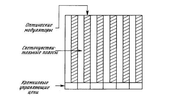 Массивы линейных модуляторов. Линейный модулятор, недостаточно изученное до настоящего времени устройство, позволяет надеяться на существенное упрощение структуры электронно-оптических сетей. Как показано на рис. 9.3, линейный модулятор представляет собой тонкую пластину с чередующимися полосками светочувствительного материала и полосками оптических модуляторов. Прозрачность каждой полосы, соответствующей оптическому модулятору, может быть изменена электронным способом.