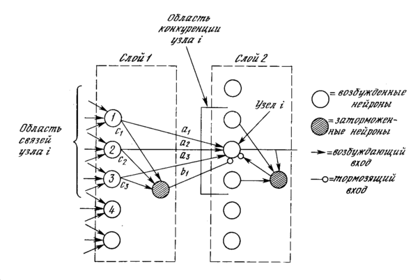 Тормозящие нейроны. В когнитроне слой состоит из возбуждающих и тормозящих узлов. Как показано на рис. 10.4, нейрон слоя 2 имеет область связи, для которой он имеет синаптические соединения с набором выходов нейронов в слое 1. Аналогично в слое 1 существует тормозящий нейрон, имеющий ту же область связи. Синаптические веса тормозящих узлов не изменяются в процессе обучения; их веса заранее установлены таким образом, что сумма весов в любом из тормозящих нейронов равна единице. В соответствии с этими ограничениями, выход тормозящего узла INHIB является взвешенной суммой его входов, которые в данном случае представляют собой среднее арифметическое выходов возбуждающих нейронов, к которым он подсоединен. Таким образом,