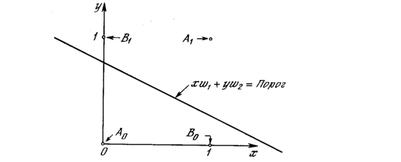 Ясно, что все точки по одну сторону пороговой прямой спроецируются в значения NET, большие порога, а точки по другую сторону дадут меньшие значения NET. Таким образом, пороговая прямая разбивает плоскость х-у на две области. Во всех точках по одну сторону пороговой прямой значение OUT равно единице, по другую сторону – нулю.