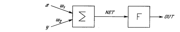 В сети на рис. 2.4 функция F является обычным порогом, так что OUT принимает значение ноль, когда NET меньше 0,5, и единица в случае, когда NET больше или равно 0,5. Нейрон выполняет следующее вычисление:
