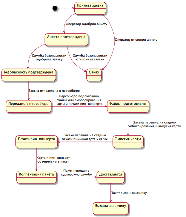 Создаваемая система предназначена для приёма заявлений на выпуск банковских карт в крупном банке Российской Федерации. Система сопровождает заявку в течение всего процесса обработки: приём, оформление, взаимодействие с бюро кредитных историй и фрод-машиной банка, процессинг в персобюро, доставка и выдача карты заявителю.