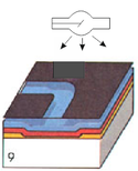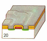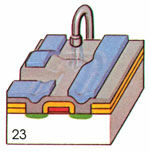 | В результате последнего травления металл остается лишь в окнах, ведущих к зонам n-типа и на соединительных дорожках, проложенных на поверхности. |