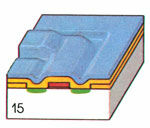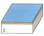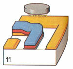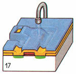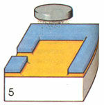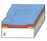 | Кремниевый субстрат p-типа покрывают изолирующим слоем двуокиси кремния (желтый) в газовой печи при очень высокой температуре. | Накладывая слой рентгенорезистивного материала (синий) эмульсии, чувствительной только к ультрафиолетовому излучению, подготавливают кристалл к наложению первой рентгеномаски |