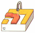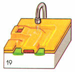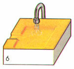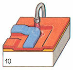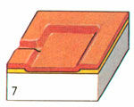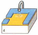 | L-образная структура рентгенорезиста затвердевает под действием света; остальную часть поверхности закрывает маска. | Необлученный рентгенорезист смывают растворителем; остается лишь затвердевшая L-образная структура. |