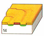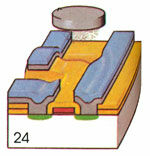 | Оставшийся рентгенорезист удаляют. Две области n-типа (зеленые) служат истоком и стоком. | Всю поверхность покрывают тонким слоем алюминия, который заполняет и окна для электрических контактов. | ||||||